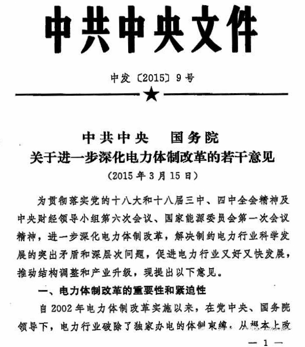 《关于进一步深化电力体制改革的若干意见》